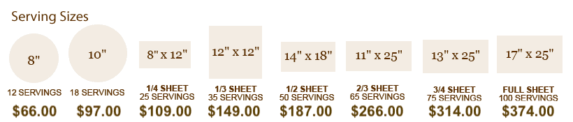 These prices apply to the standard design pictured above. Custom Designs, fondant work, tiered cakes and custom floral arrangements are all additional charges. Please call our shop for pricing on custom designed cakes at 203-488-2800.