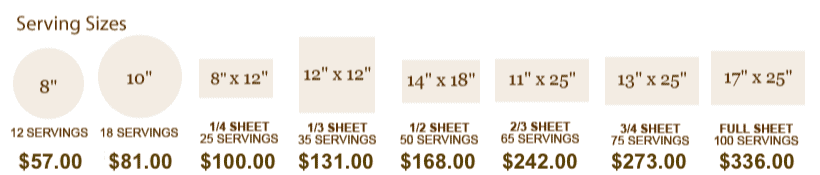 These prices apply to the standard design pictured above. Custom Designs, fondant work, tiered cakes and custom floral arrangements are all additional charges. Please call our shop for pricing on custom designed cakes at 203-488-2800.