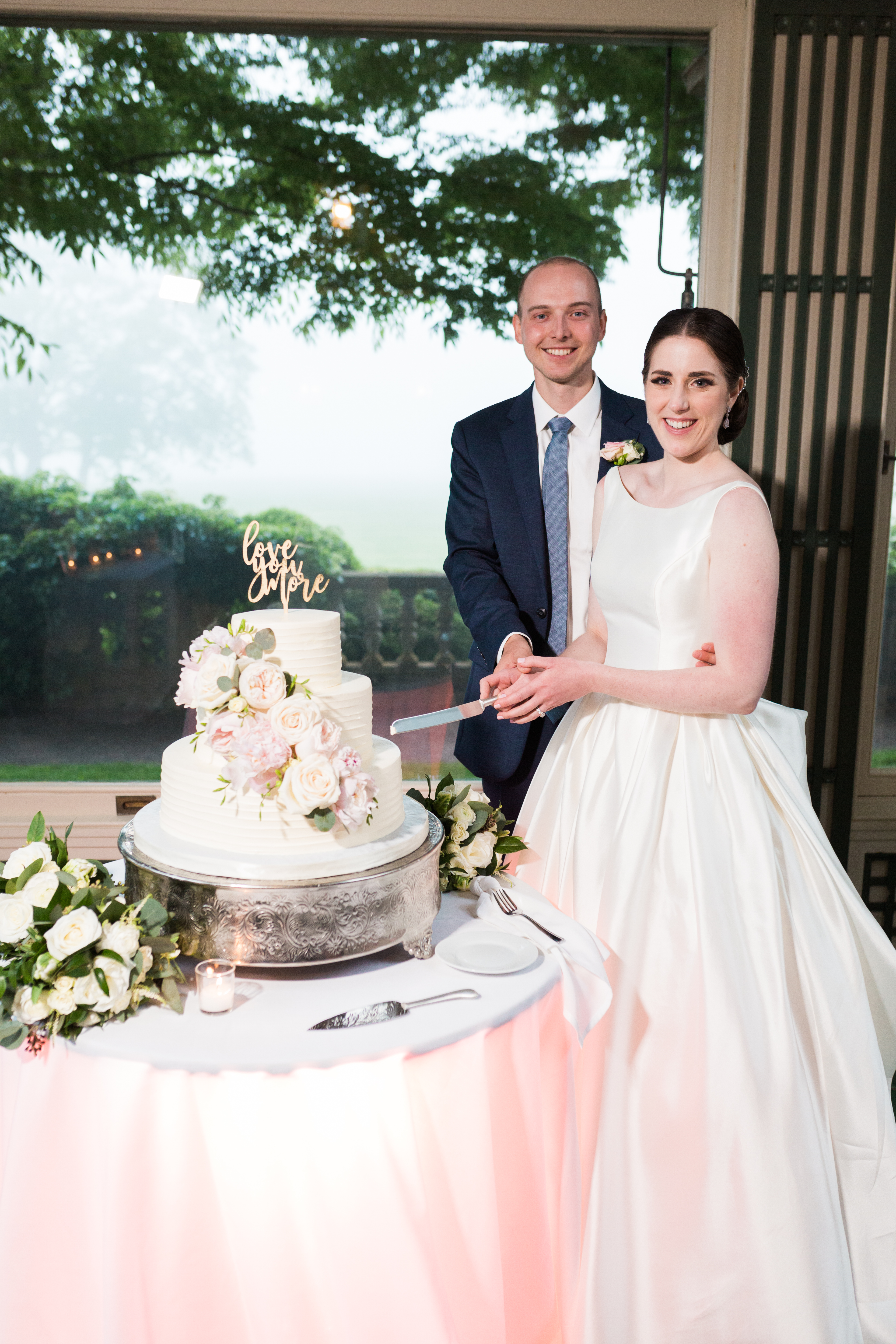 For their dessert, the couple chose a simple, but romantic three-tiered cake with textured buttercream frosting. JCakes also provided and placed a cascade of ivory roses, blush peonies, pale pink garden roses, freesia, and eucalyptus. For flavors, the top tier was golden cake with strawberry shortcake filling, the middle tier was golden cake with chocolate truffle filling, and the bottom tier was golden cake with raspberry buttercream filling. All three tiers were frosted with JCakes’ signature vanilla French buttercream. The cake was topped with a simple “Love You More” cake topper and placed on a silver cake stand to add a bit of glitz.
