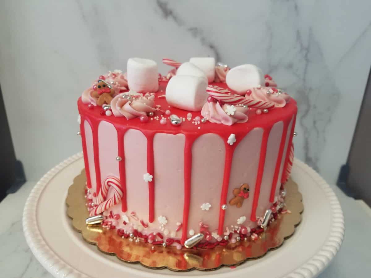 Red Velvet cake filled with cream cheese and frosted in pink Vanilla French buttercream. Accented with marshmallows, candy canes, sugar pearls, sprinkles and gingerbread men. Please provide at least 5 days notice.