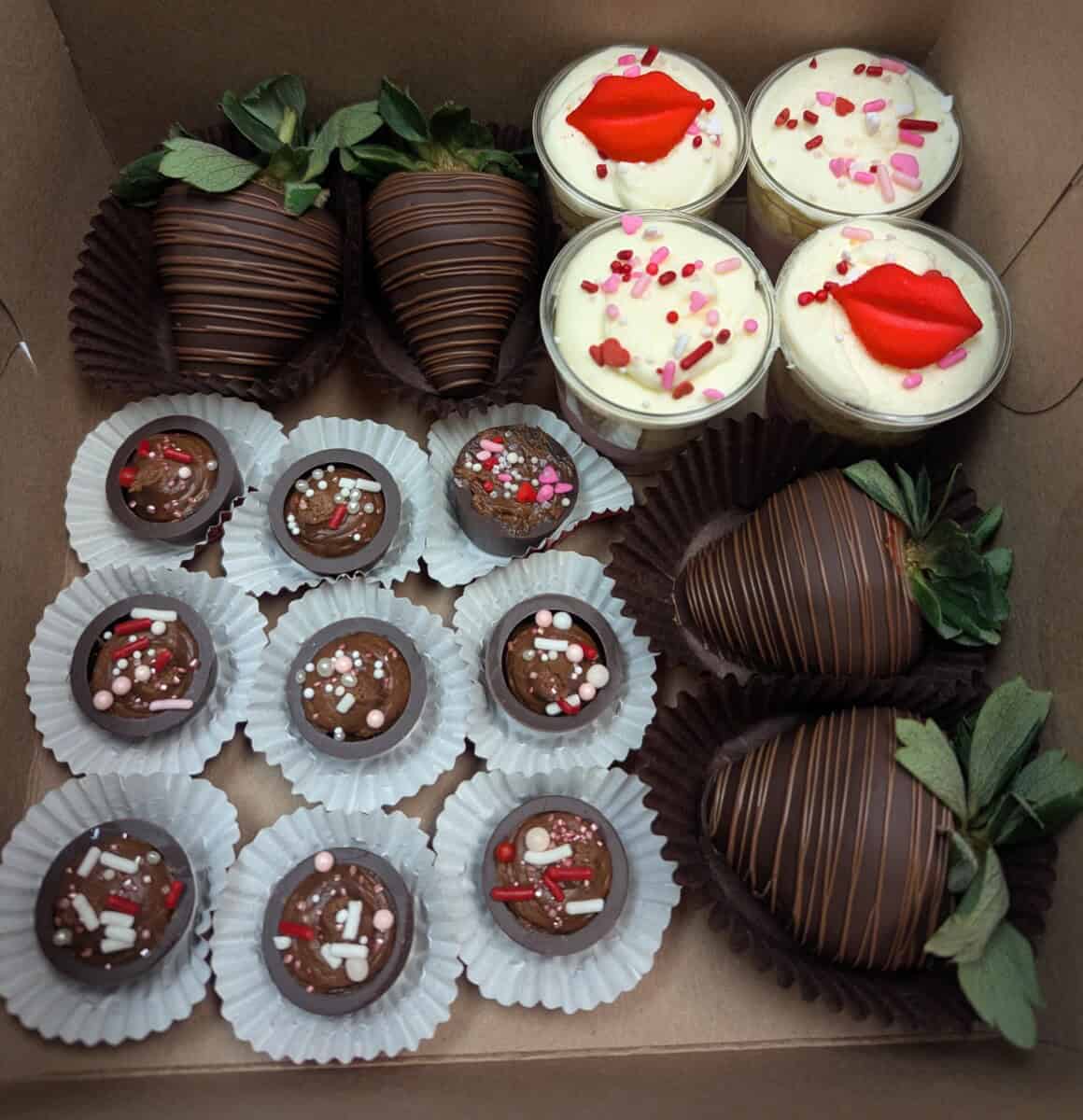 This small box includes four chocolate dipped strawberries, four raspberry buttercream cake shooters and nine chocolate mousse cups to share with your favorite person!